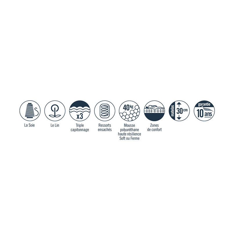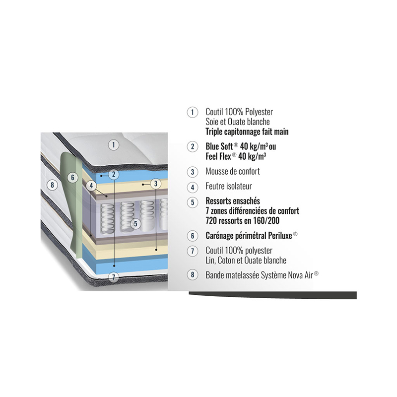 Matelas en ressorts ensachés de suspension Neospring®, 2 faces Blue Soft® de 45 kg/m³ pour le confort équilibré ou 2 faces Feel Flex® de 55 kg/m³ pour le confort ferme.